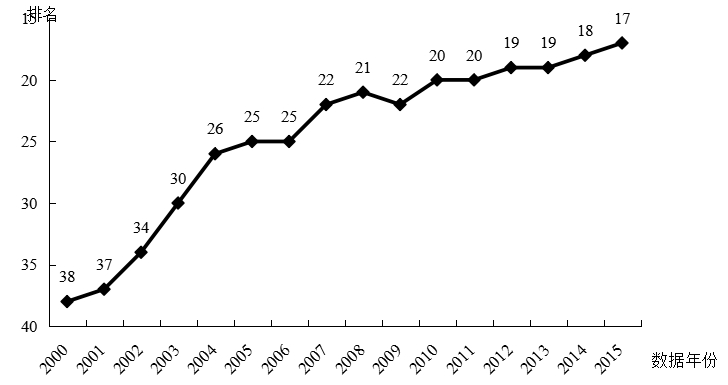 在40個(gè)參評(píng)國家中,中國國家創(chuàng)新指數(shù)綜合排名比上年提升了1位,繼上年超越澳大利亞之后,今年又進(jìn)一步超越比利時(shí),位居第17位。這表明我國國家創(chuàng)新能力繼續(xù)穩(wěn)步提升(見圖1)。