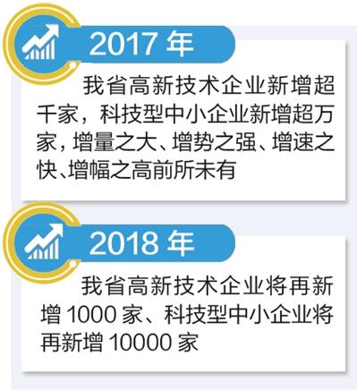 2018年我省高新技術(shù)企業(yè)和科技型中小企業(yè)將分別再新增1000家、10000家。記者從2月5日召開的全省科技工作會(huì)議上獲悉,到今年底,我省高新技術(shù)企業(yè)將超過(guò)4000家,科技型中小企業(yè)將達(dá)到62000家。
