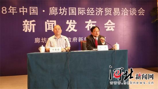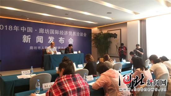 5月14日上午,2018年中國·廊坊國際經(jīng)濟(jì)貿(mào)易洽談會召開第二次新聞發(fā)布會。圖為會議現(xiàn)場。通訊員李松潔攝