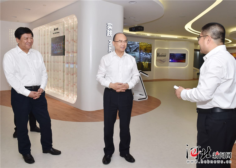 5月17日上午,省長許勤深入廊坊市部分高新技術(shù)企業(yè)進(jìn)行調(diào)研。這是許勤在維信諾(固安)公司是維信諾科技股份有限公司旗下全資子公司,詳細(xì)了解企業(yè)創(chuàng)新成果。記者孟宇光攝