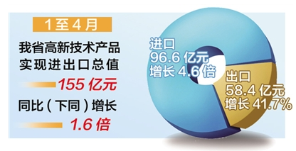 本報訊(記者邢杰冉通訊員楊寶麗)據(jù)石家莊海關(guān)統(tǒng)計,1至4月,我省高新技術(shù)產(chǎn)品實現(xiàn)進出口總值155億元,同比(下同)增長1.6倍。其中出口58.4億元,增長41.7%;進口96.6億元,增長4.6倍。